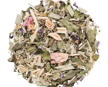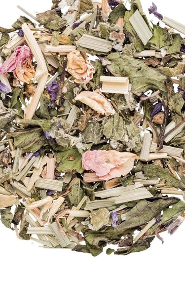 Lemongrass, peppermint, raspberry leaves, cardamon, licorice, mallow flowers, rose petals.